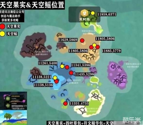 天空果主要分布在天空群岛附近,下图中标记红色的部分就是天空果的刷新位置,黄色部分为天空鳐的刷新位置。