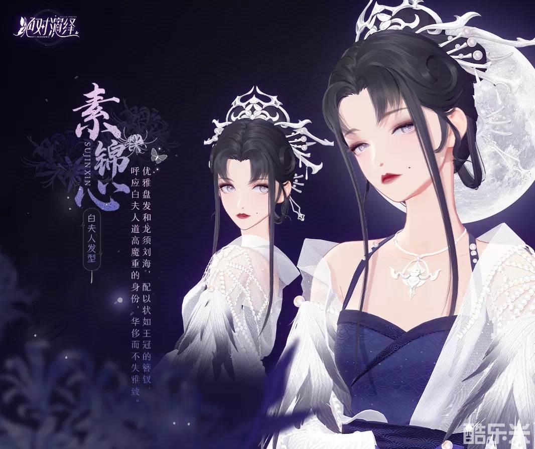 和戏服一起上线的,还有配套的发型【锦素心】。优雅盘发衬托清冷气质,古装风满满的龙须刘海随风飘逸,不难想象白夫人盘旋天地时的轻盈身姿。而盘点缀在黑发上的、优雅华丽的纯白发簪,则暗示了白夫人白骨的身份,以及高强的法力。