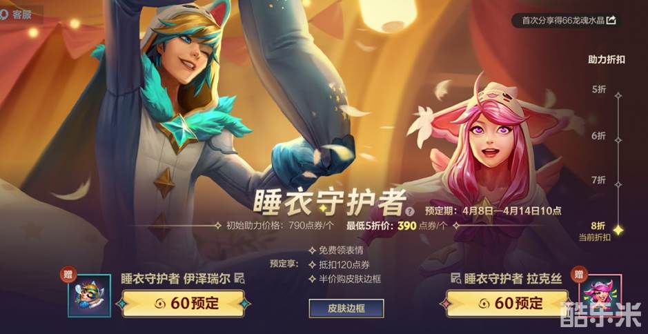 睡衣守护者系列皮肤预定开启,本次共上架两款皮肤(睡衣守护者 伊泽瑞尔,睡衣守护者 拉克丝)活动时间4月8日11:00:00(陆续开启)—4月25日23:59:59,活动分为预定期与购买期。