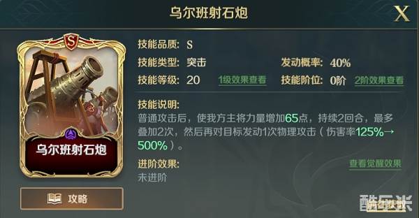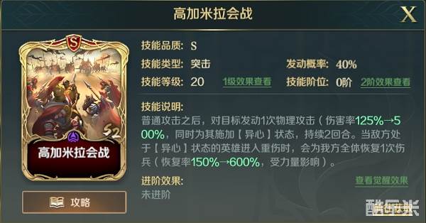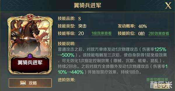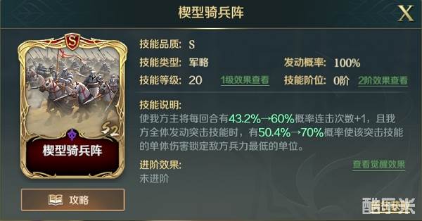 该技能可以为主将增加力量,同时为单目标伤害技能,可以能更好的触发楔型骑兵阵的集火敌方兵力最低目标的效果。