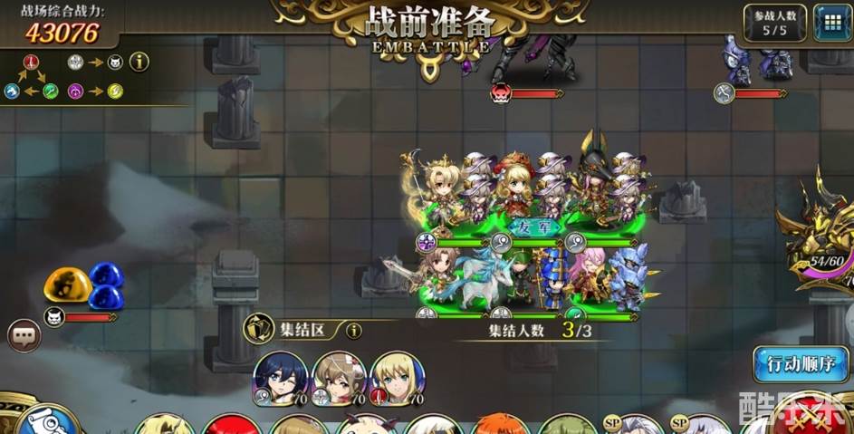 可以看到准备界面里多了个集结区,可以理解为替补队员,随时可以替换场上英雄,这样一个回合里就多了几个人可以帮忙打了,当然是有替换次数限制的。下场休息的英雄可以回血、冷却技能CD、慢慢清DEBUFF。