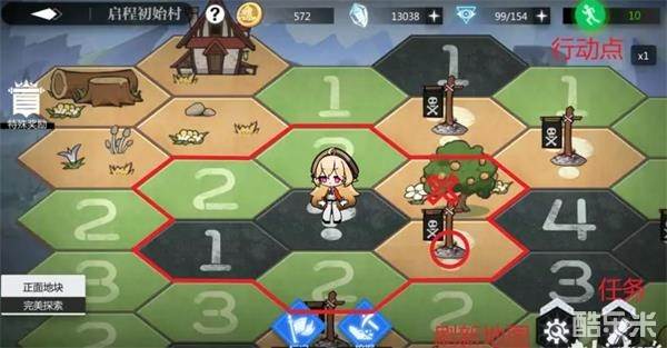 玩家操控可可进入地图,在可互动地块上可以进行挖掘与标记,每次进入地图时会获得30个行动点(首次为40个),每次挖掘会消耗1个行动点,耗尽则无法再进行挖掘。挖掘之后,地块会显示其颜色(绿色或黑色)及周围范围内的同类型地块数量(范围如图中可可位置所示),玩家需要根据挖掘地块显示的数字,推测周围的地块分布情况,以此充分利用行动点数。标记(实例图中红色圈表示)主要用以标注出玩家推测得出的黑色地块,帮助玩家区分。