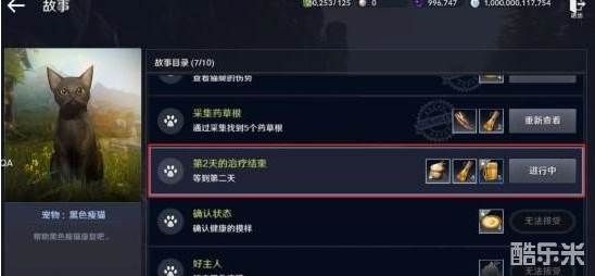 第二天采集完成5个草药根(可通过采集或者交易所获得哦)之后,给与小猫再次治疗,再次等待一天,小伙伴们加油~~
