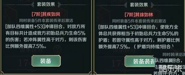 其疾如风和其徐如林传承套装可在冲锋回合给敌军造成伤害或给己方提供护盾,适合想要在前几回合造成更高爆发伤害或抵挡高爆发的队伍携带。