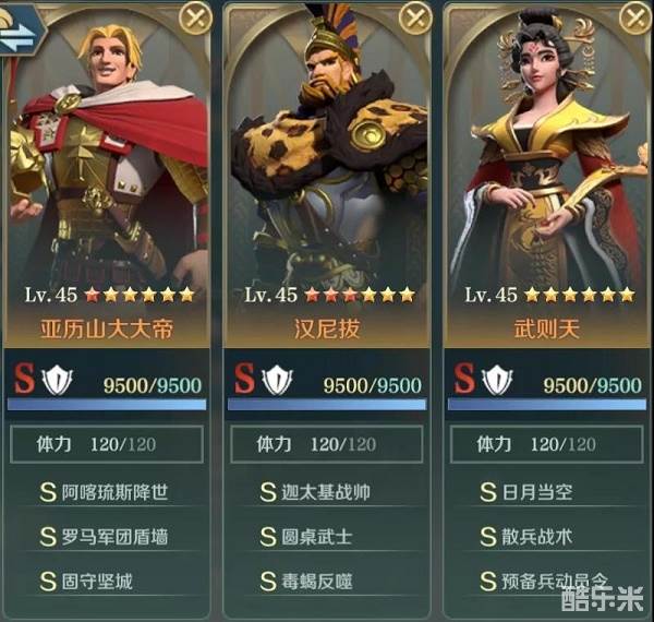 在有散兵战术的情况下,推荐用亚历山大做主将,能给汉尼拔增加伤害,以及给武则天增加回复量。依靠武则天自带技能日月当空,削弱敌军爆发,并配合预备兵动员令,达到长续航的目的,为汉尼拔提供输出空间。