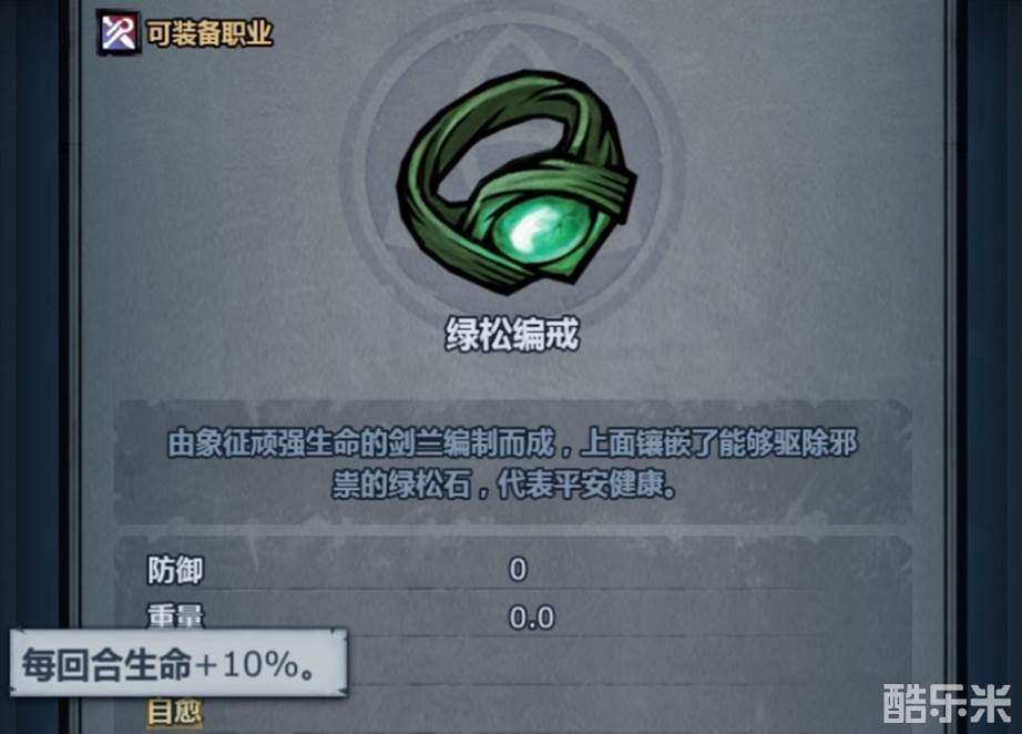 2、绿松编戒的属性是4体质、14负重、数值并不低;