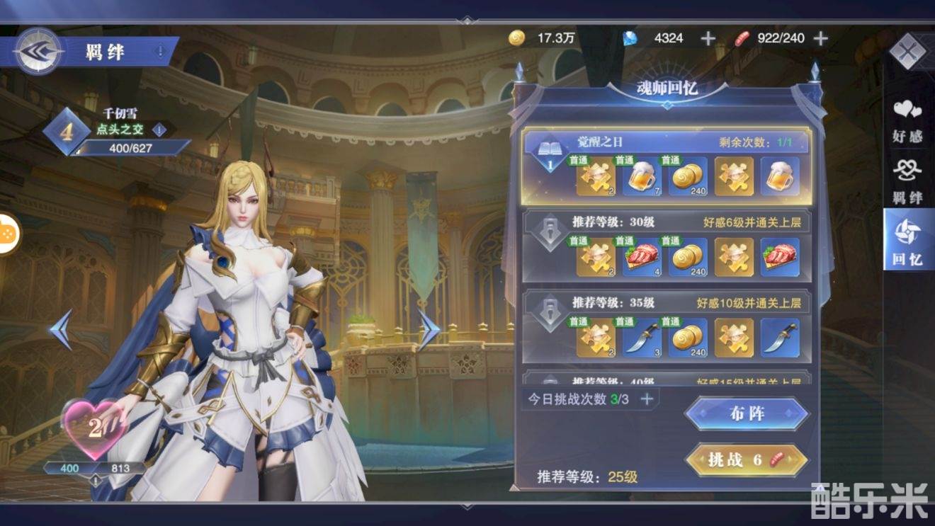 总参与次数可通过消耗钻石进行购买,首次通关某回忆时, 可获得对应的首通奖励。
