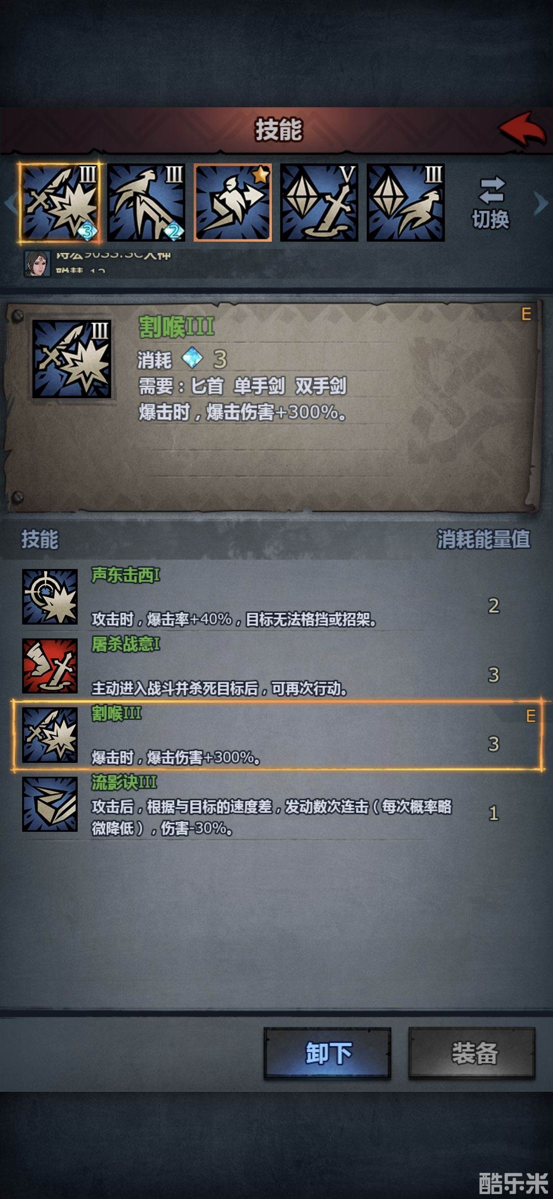 主动2:移形幻影2能量,使敌人无法格挡招架,还加暴击率为割喉服务,3级就行,越高越好。