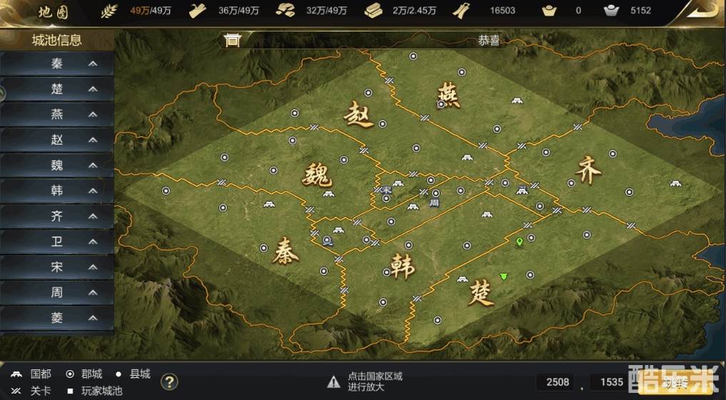 在地图上会遇到各种等级的资源地,占领资源矿时会对几级地对应有几个NPC部队进行战斗。可提前土地守军查看守军信息。另外空地虽然提供的资源产出较少,但是却可以快速的连接格子,连接格子主要为了拓展自身领土面积,其次部分城池、关卡占领要求需要与玩家领土接壤。当天下大势开启关卡功能时,世族就可以宣战部分接壤中立资源国的关卡,中立资源国分别有四国,菱、卫、宋、周,该类国家资源地丰富,是各国必争之地。