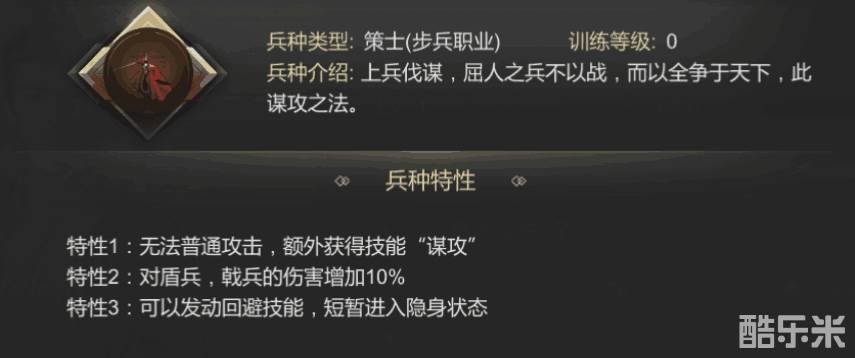 兵种种类主要分为三大块,步兵、骑兵、器械,总计有12种兵种;克制效果上如戟兵对骑兵类增加伤害,策士则是对盾兵,戟兵增加伤害。