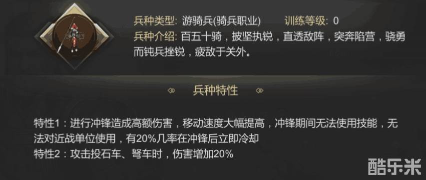 骑兵类除了弓骑兵无法使用冲锋兵种技,其余均可对策士、弓箭手、弩兵、投石车、弩车进行冲锋,造成大量伤害,移动速度大幅提升,冲锋期间无法使用技能。