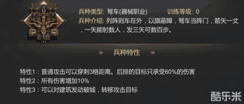 器械兵种:战车、投石车、弩车;