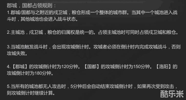 城池守将阵亡时需要重生时间复活,请把握好攻城时间,只有清理玩守将,部队才会自动攻击最邻近的城防建筑,当城门或城墙被攻陷时,部队会自动进入内城进攻都府建筑,攻城时间按照县城,郡城,国都,洛阳不同计算;洛阳180分钟 国都150分钟,郡城120分钟,县城60分钟,关卡30分钟。