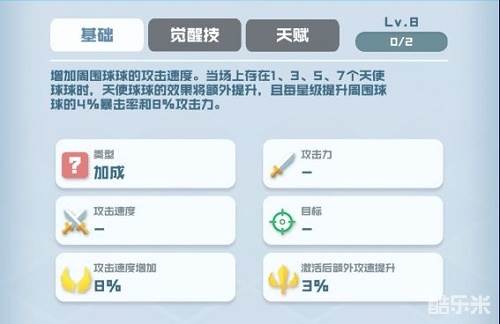 变身状态:当场上有一个天使球球时(局外等级8级时)提供的攻速为11%,达到不同变身条件(场上存在天使球球1、3、5、7个球球时)攻速增益越高。