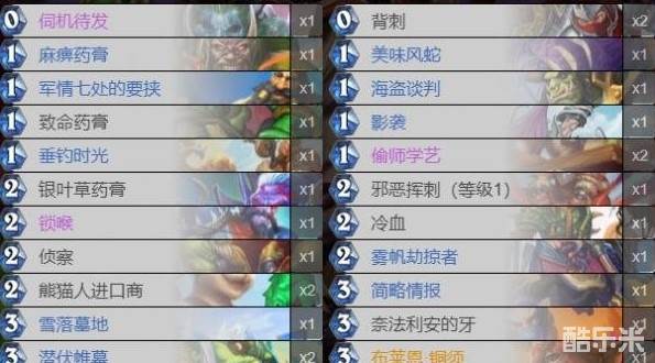 1费:麻痹药膏x1;美味风蛇x1;军情七处的要挟x1;海盗谈判x1;致命药膏x1;影袭x1;垂钓时光x1;偷师学艺x2