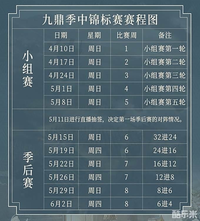 5月11日,当所有小组赛的入围者决出后,将进行季后赛抽签分组的现场直播。在季后赛阶段,季中赛将采用九鼎经典的双败淘汰制,谁将笑到最后,让我们拭目以待。