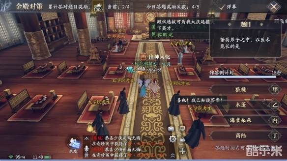 前往京都太学学正处触发,以答题的形式完成,回答五题,无论对错,每题都能获得阅历,答对能获得“30000+40000”阅历,答错减半则获得“30000+20000”。