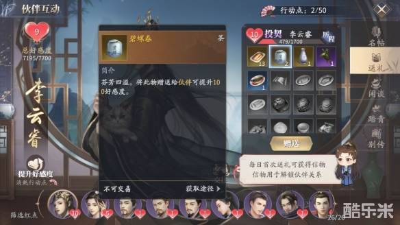 为了接近长公主,我们可以投其所好,向她赠送礼物,碧螺春,罗浮春可都是佳品,能增加不少好感度,赠送普通的紫色和蓝色道具,也可以积累好感度。