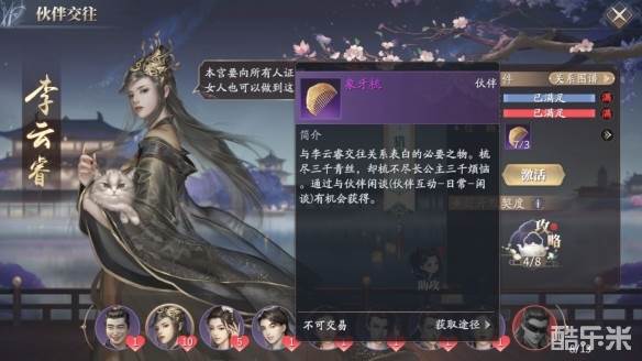 解锁与伙伴之间的关系,长公主可解锁“猎物”、“嘉宾”、“闺蜜”,需要使用到信物,每一层关系所要的信物不尽相同。像“猎物”要用到象牙梳,“闺蜜”则需使用龙涎香与蔻丹;同时对我们与长公主的好感度、默契度也有一定的要求。