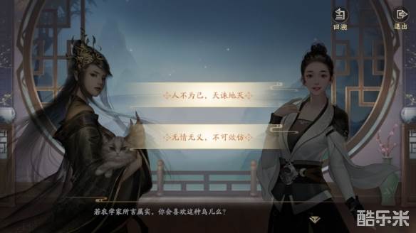 默契度可通过完成攻略提升,点击“攻略”会进入剧情场景对话,选择正确的回复,便能够提升默契度;比如说在“笼中之鸟”这段对话中,长公主与我们聊到了子规,这种鸟会把蛋下到其他鸟的巢穴中,接着话锋一转问我们对这种鸟怎么看,表面是在问鸟,实际上是在问人。所谓“伴君如伴虎”,这答错一句,那可就有性命之忧,所以这个时候应该照着长公主的意思,回答“人不为己,天诛地灭”,方能讨得其欢心。