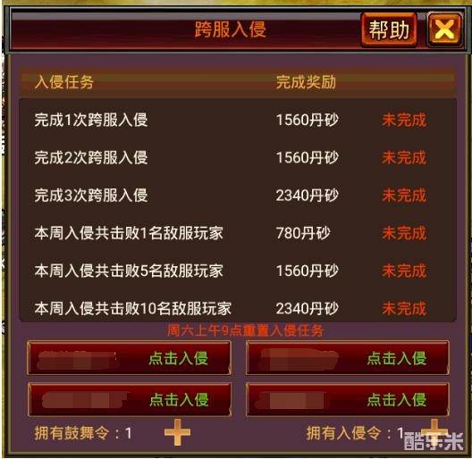 ·跨服入侵系统奖励资源为“丹砂”,可用于激活图鉴收集目标。