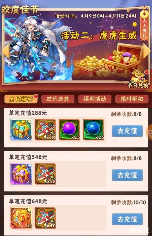 少年们单笔充值指定金额,即可得到虎虎生威碎片箱、玄金宝物任选包、玄金装碎片任选箱、神火丸等珍稀道具!并且可以和欢庆佳节中的充值活动叠加,千万不要错过哟~