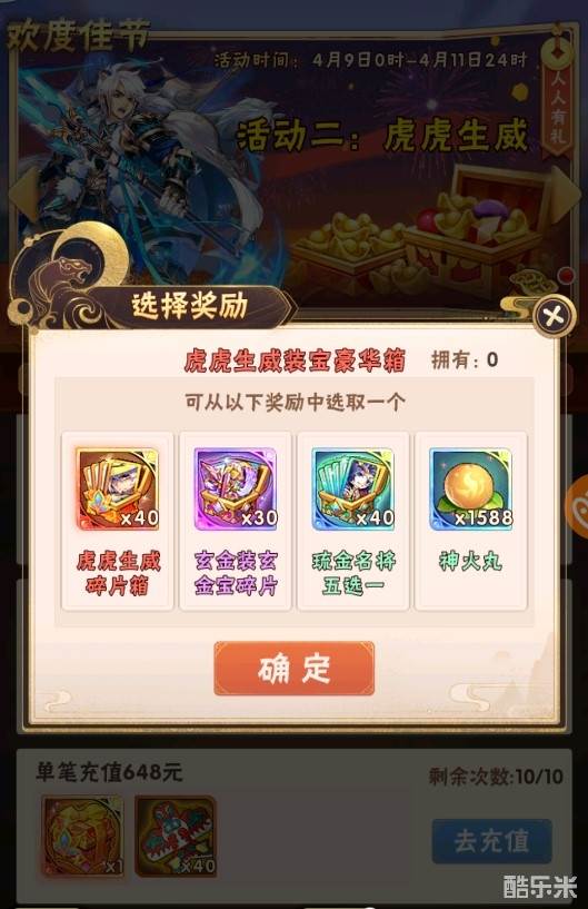 在活动期间少年们单笔充值至指定金额,即可获得虎虎生威碎片箱、玄金装玄金宝碎片箱、琉金名将五选一、神火丸、纸鸢等资源: