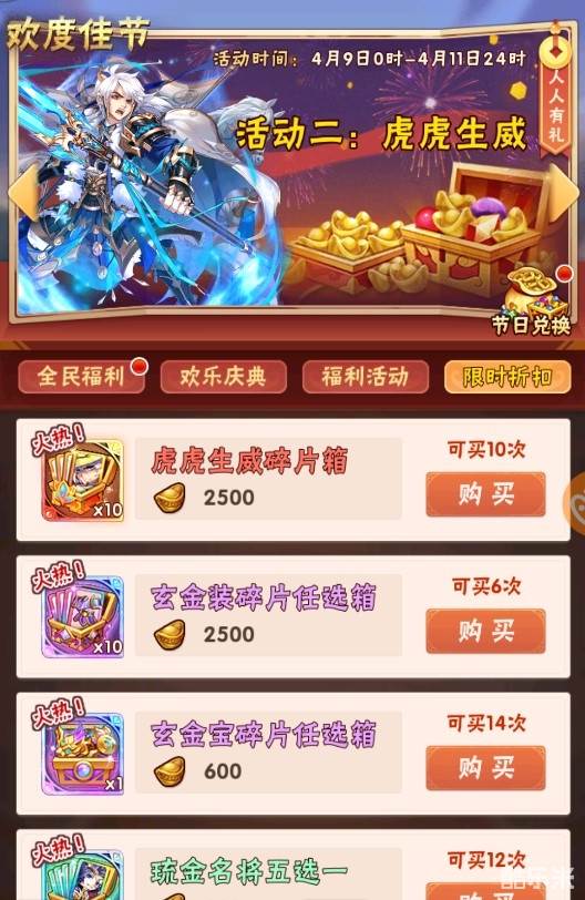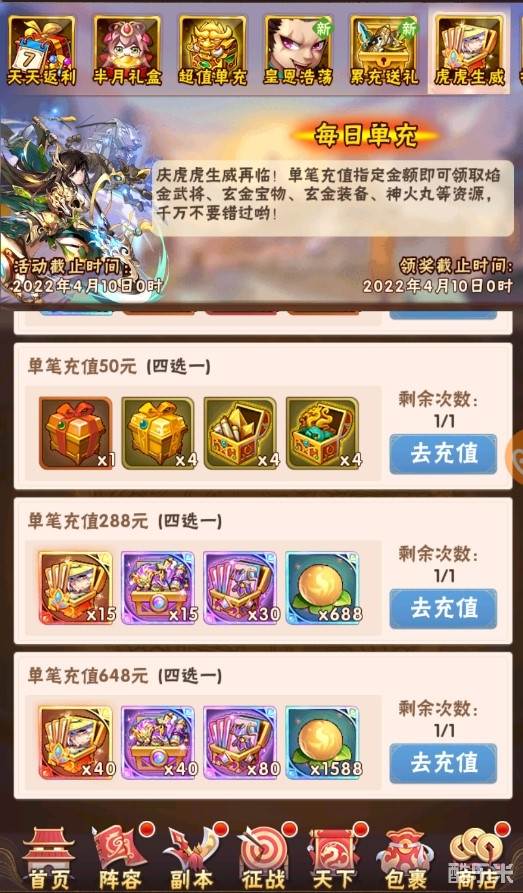 踏春欢庆第二轮开启!焰金武将惊喜回归,玄金装宝强势来袭!每日单充限时开启,焰金武将再现三国!周基金优惠上架,玄金战宠联袂助阵!超值单充华丽上线,玄金装宝不容错过!福利回馈,每日签到领异神穷奇!