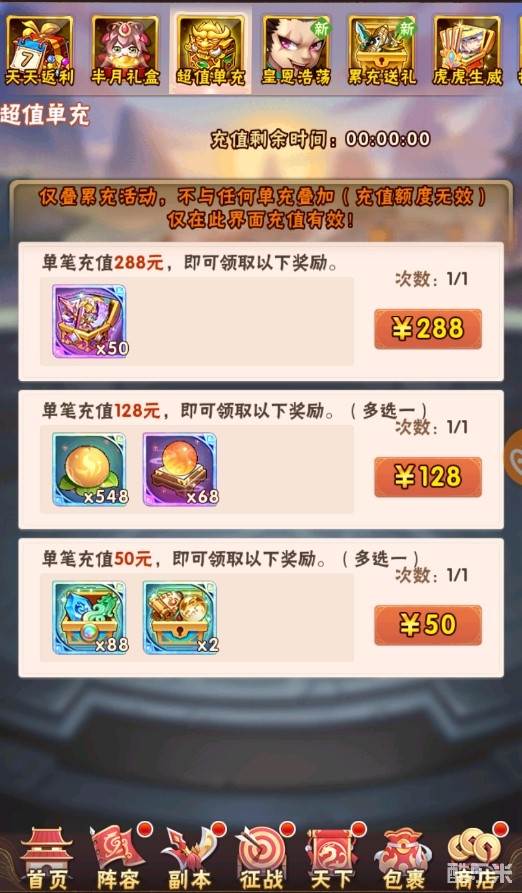 4.超值单充的充值不与任何形式的单充活动叠加,如:欢庆佳节中单笔充值活动、天天返利、月基金、周基金、月卡、豪华签到等;