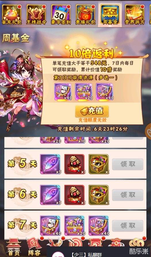 活动规则:在活动期间,7天内任意1天充值548及以上,都能立即激活周基金,领取当前天数所有奖励!7天内可获得如下奖励: