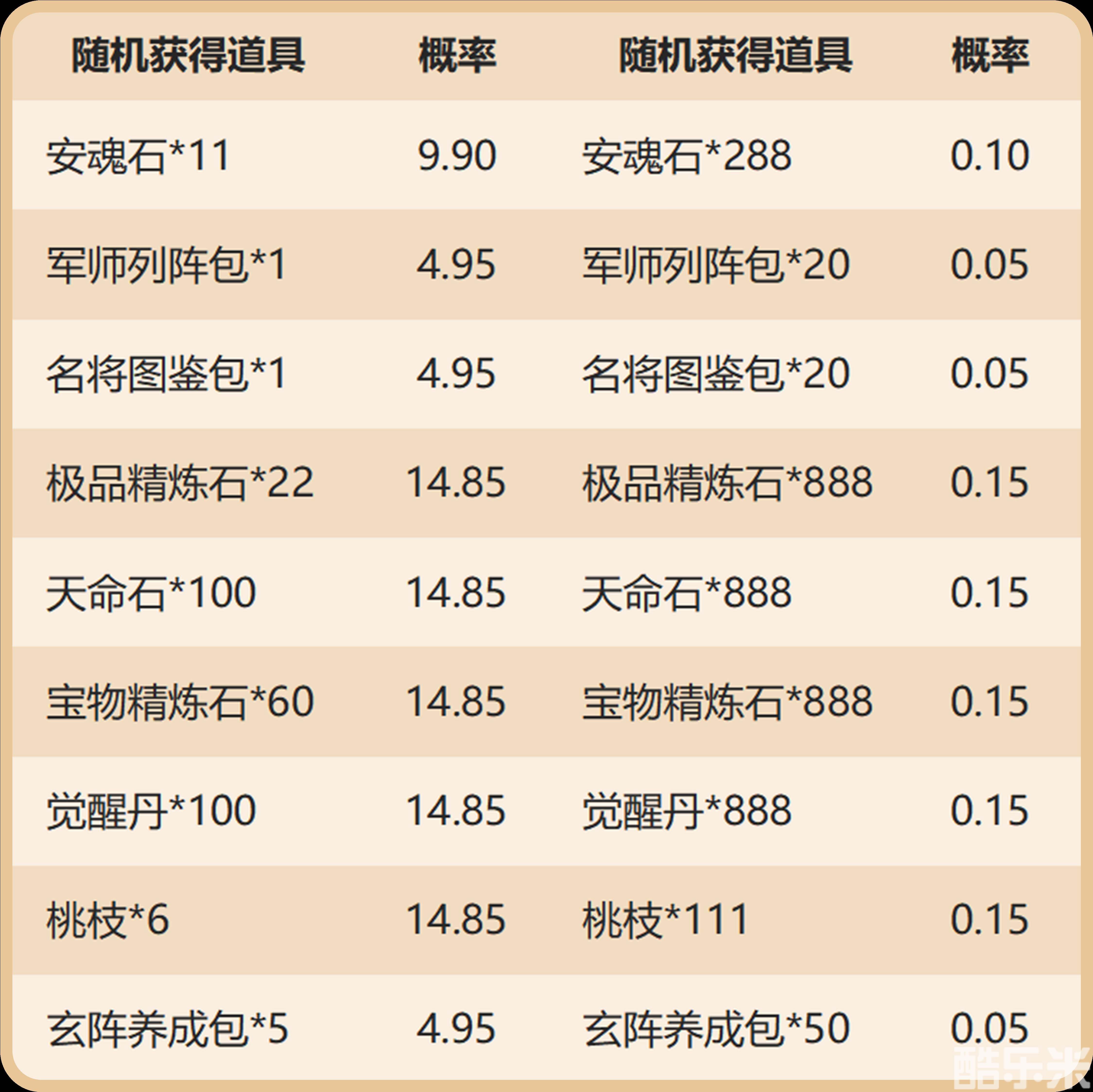 3.「踏春礼盒」可开出:桃枝*111、玄阵养成包*50、觉醒丹*888、天命石*888、极品精炼石*888、安魂石*666、军师列阵包*40、名将图鉴包*40、宝物精炼石*888、桃枝*6、玄阵养成包*5、觉醒丹*100、天命石*100、极品精炼石*22、安魂石*11、军师列阵包*1、名将图鉴包*1、宝物精炼石*60中的随机1种。