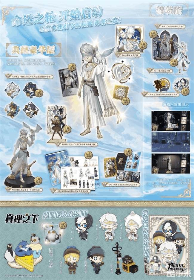四周年限定礼盒分为精装版和典藏版两款,均包含先知-“白”和先知-“重生”,精装版还包含侦探三人组限定立牌、White独占限定立牌、《真理之下》独占限定金属徽章套装等实体周边;典藏版内的礼物种类更为丰富,除了《真理之下》独占限定周年庆纪念金属徽章套装、《真理之下》-“王牌”角色限定收藏立牌、White独占限定手办等精美周边外,还含有《纯白的预言者》独占限定美术设定集、独占限定纪念卡册等珍贵藏品,带你从更多元的视角去解读全新篇章中的众多角色,从而得出最接近真相的答案。