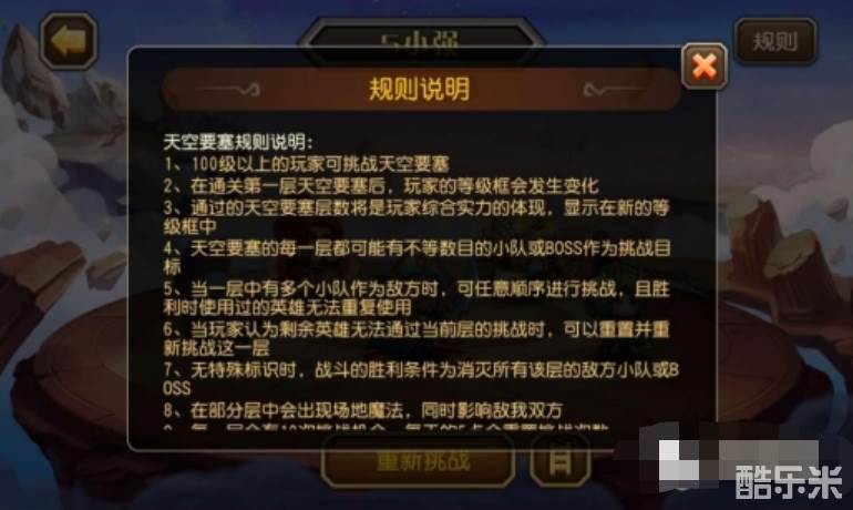 100级之后玩家就可以挑战天空要塞了,规则里解释的非常清楚,通关第一层后等级框会发生变化,具体的数字则代表玩家通过的天空要塞层数。