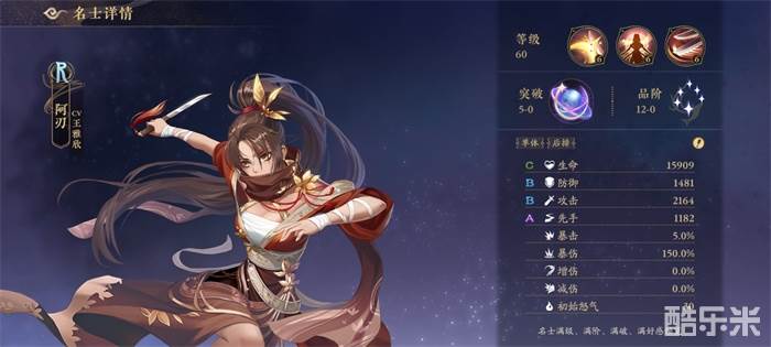 技能描述:阿刃持短刀迅疾攻击,对敌方后排单体造成攻击力190%的怒攻伤害。
