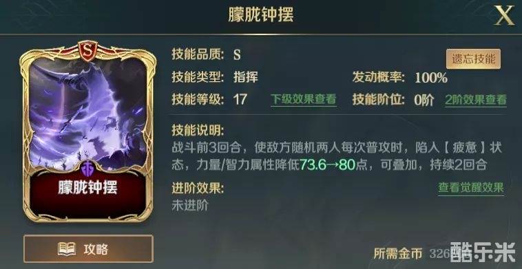 朦胧钟摆属于辅助型技能,主要用于抑制敌军输出,也可以和部分输出英雄的技能实现联动效果。以嬴政为例,嬴政携带朦胧钟摆时,前三回合的群体2人疲惫效果,能很好的触发队伍的主力输出项羽的破釜沉舟吸取属性的效果,有效降低敌军输出和坦度,并提升项羽的属性。