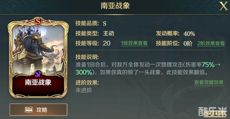 南亚战象是一个可以对敌方全体造成高额物理伤害的攻击技能,但是有一点不足就是需要准备一回合才能发动,不过综合攻击范围和伤害来看,整体技能效果还是十分不错的。