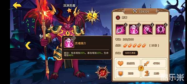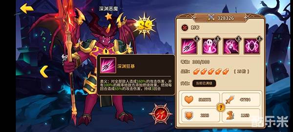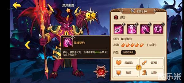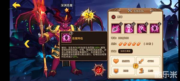 当生命为0时自身生命回复100%,解除受到的所有控制、中毒、燃烧和流血效果,并进入恶魔状态直至英雄死亡。在恶魔状态下,英雄每次攻击都将以奥义进行,在每回合结束时生命减少15%;