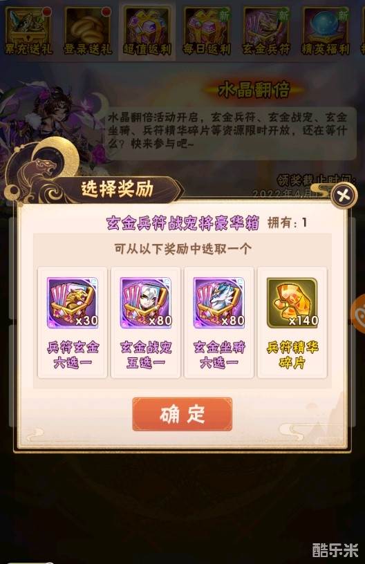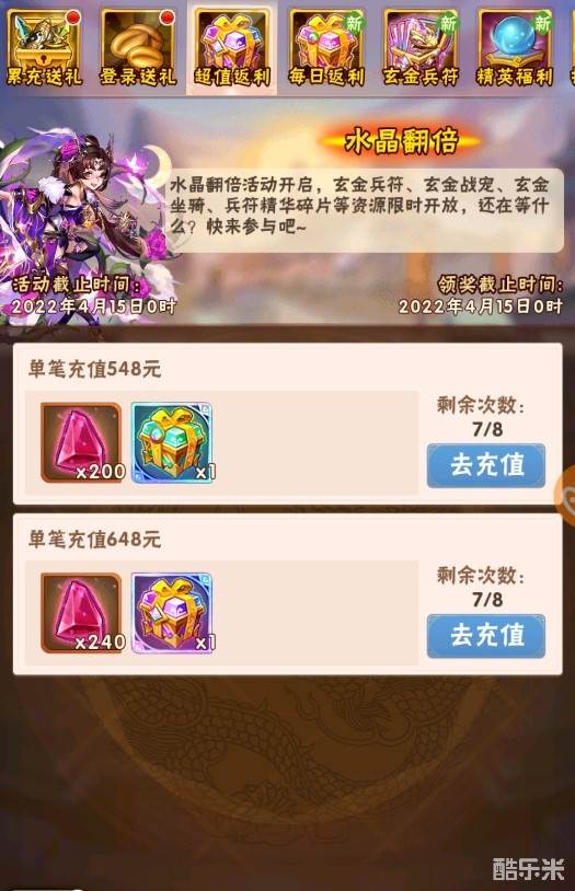 水晶翻倍活动超值开启!玄金兵符、玄金战宠霸气登场!每日单充上线,玄金兵符不容错过!时空礼包优惠来袭,逐鹿符、申命符、兵符精华任君选择!欢乐盲盒好运连连,牛转乾坤等你获取!