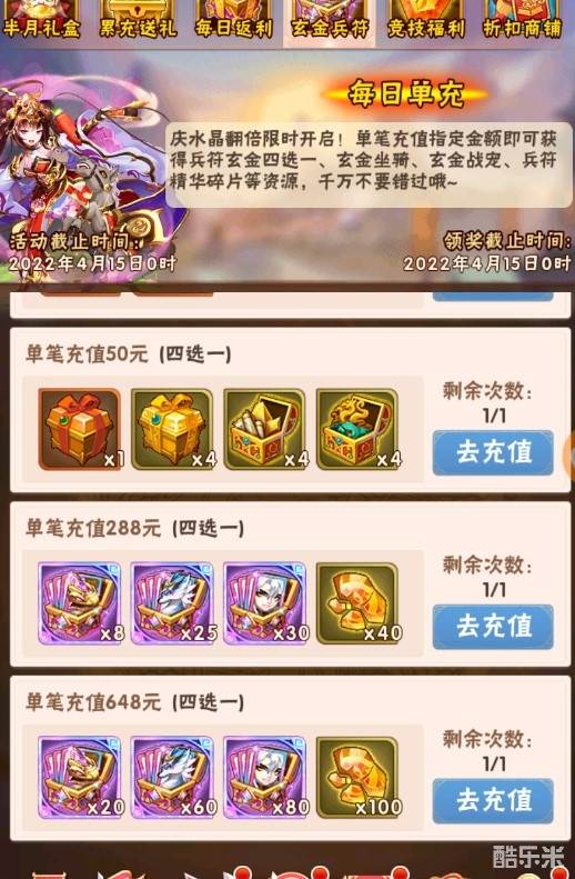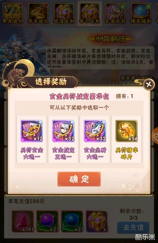 每天充值指定金额即可获得兵符玄金四选一、玄金坐骑六选一、玄金战宠五选一、兵符精华碎片珍稀资源,还可以和水晶翻倍的充值活动叠加哦!