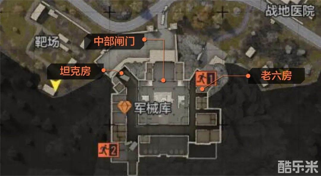 这里我就给大家讲讲进入军械库的方法和撤离的方式:如图所示,军械库的入口分别位于左边坦克房、中部闸门、和右边被先锋们称为老六房的地方,拉对应闸后分别需要等待1分钟、1分40秒和1分40秒才能进入军械库内部。