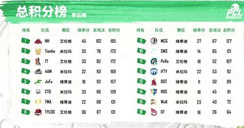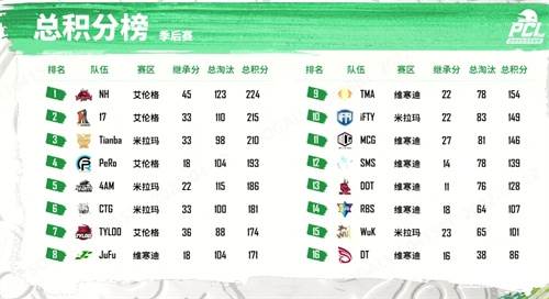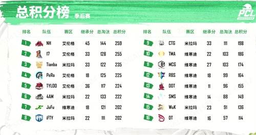 最终,NH战队以259总积分的微弱差距,领先17战队4分拿下季后赛冠军,同时NH战队也展现出了及其恐怖的统治力,以高达144的淘汰数一骑绝尘;17战队后来居上以128个淘汰数、255分位居第二;备受关注的Tianba战队也以122个淘汰数、255分拿到季后赛季军。此外,季后赛表现亮眼的PeRo战队和常规赛豪强TYLOO战队也名列前茅。