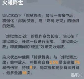 持续染火是这个分支最大的特色,可以使技能全程附带染火效果的加成。