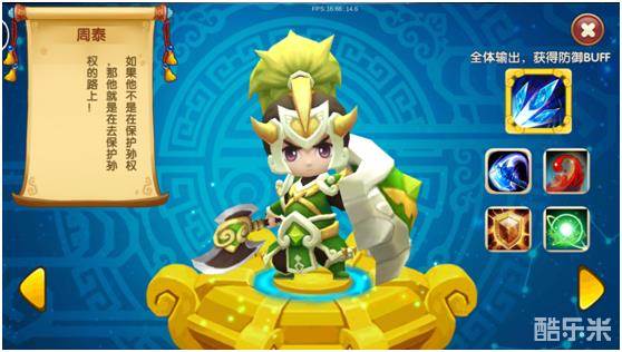 作为删档测试版本初始五小强之一,周泰可谓是集坦克、控制于一身,能够很好的在队伍输出还不够强力时抵挡大部份怪物伤害,同时无双技的冰冻效果能够很好的打断及控制敌方输出,乱舞技开启后12秒的减伤效果逆天。被动技能也是纯粹为前排武将订制,后期武将升紫后推荐可搭配输出型前排组建双前排队伍。