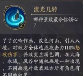 这个技能是能够让敌人在受到攻击的时候,会随机进入任意的一种画境之中,并且能够对全体敌人造成110%的攻击,同时能够将主场的色调调整。