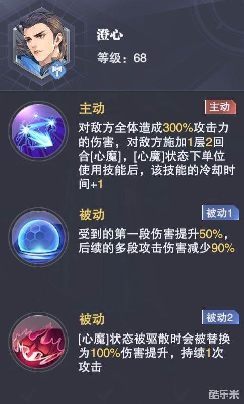 澄心的技能主要有2个效果:受到的第一段伤害提升50%,后续多段伤害降低90%群体攻击给我方施加的【心魔】状态在被驱散时会提升我方100%的伤害提升,持续1次攻击结合这两点,虽然说这关的效果对于唐晨暗器队并不是很友好,但客观说对于猫队来讲也不是很友方......毕竟猫队的多段反击也是其增伤的核心手段之一,所以这关大家如果有能力的话还是直接用唐晨暗器队来打即可。另外如果没有波赛西可以压制boss魂力的话,可以适当带一位奥斯卡来驱散boss的【心魔】状态,这样也可以为我方提供更好的输出环境。