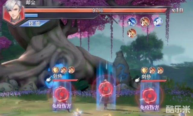 另外却尘在开局的时候身边会有2个小弟,小弟可以免疫攻击,不过在受到12段攻击后便会挂掉,而却尘在小弟存活期间是有伤害加成的,所以如果大家的练度并不是非常高,需要在开局后迅速解决掉2个小弟。