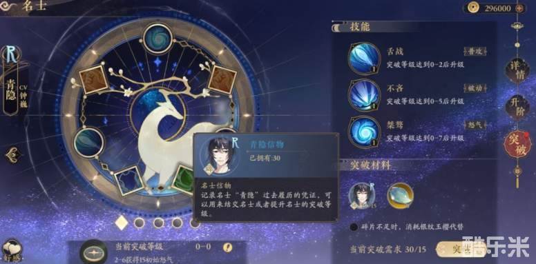 1、名士进行突破首先需要达到当前的等级上限,之后需要消耗一定数量的名士信物,或者稀有材料「银纹玉樱」