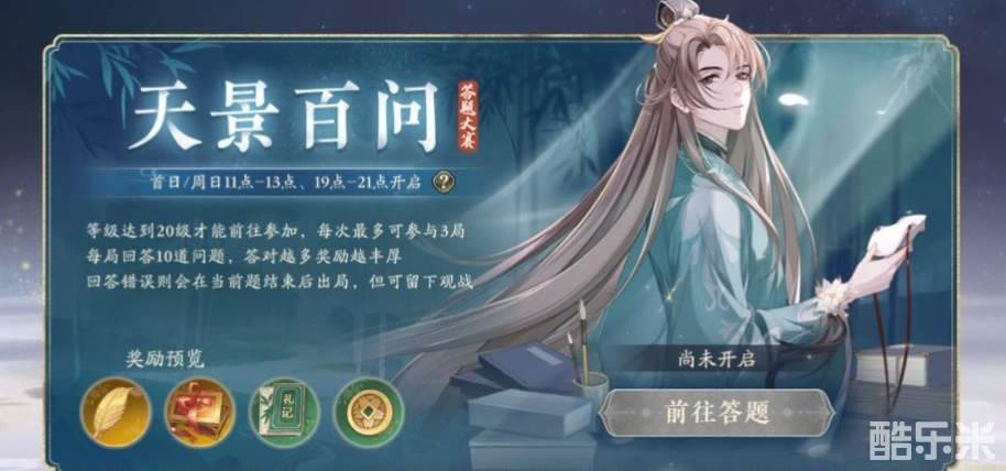 1、活动参与条件:玩家等级达到20级即可参与比赛,每次最多可以参与3场比赛;每次活动中一共有10个问题,玩家答对多的问题越多,获得的奖励也越丰厚;