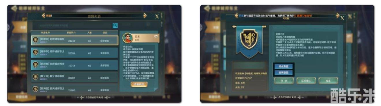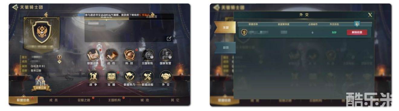 在联盟界面,可以找到外交。在这里,可以点击上方的搜索按钮查看联盟列表,找到自己想结为友盟的联盟,再点击外交,就可以看到结为友盟的申请选项。发起申请后,若申请联盟同意,两个联盟即可成为友盟。