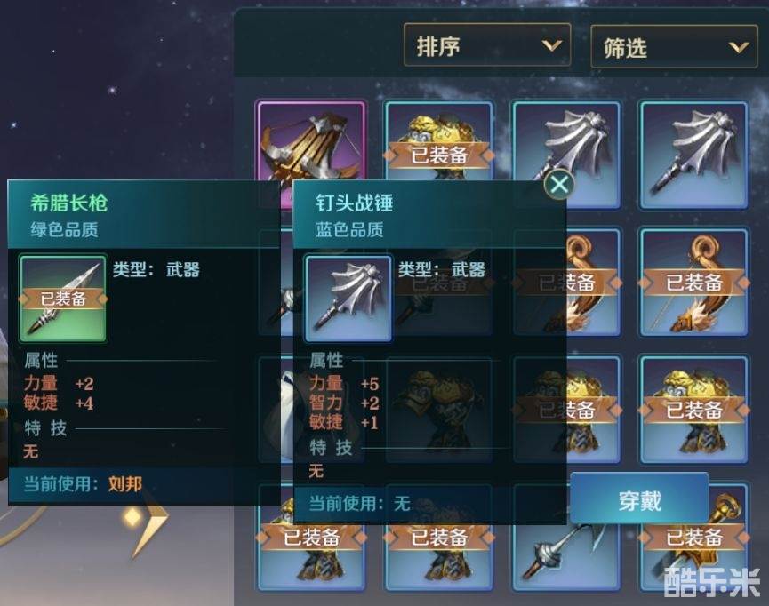 英雄装备跟英雄加点类似,每一点基础属性就相当于是一次加点,所以在选择装备的过程中,我们可以对英雄自身的类型去决定,例:物理伤害型英雄建议佩戴力量属性高的装备。